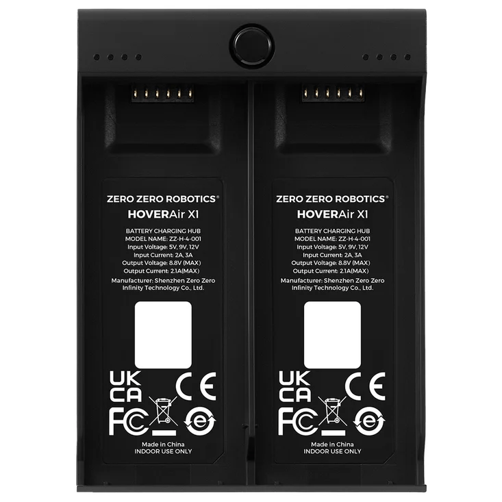 Drop up to two HoverAir X1 batteries into the hub. It auto-detects levels and charges the fullest one first—so you grab a ready-to-fly battery faster.