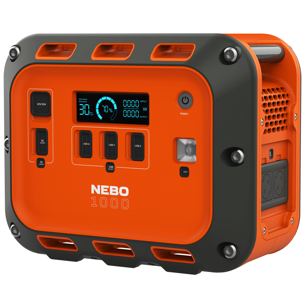 Draagbaar 1000W stroomstation met EU-stopcontact—NEBO Intrepid 1000 houdt je apparaten overal opgeladen met een batterij van hoge capaciteit, meerdere uitgangen en robuust ontwerp voor buiten- en noodgebruik.
