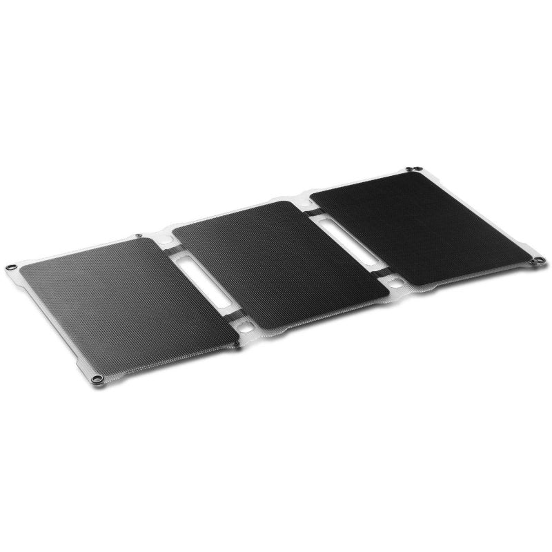 Duurzaam 21 W zonnepaneel met driedelig ontwerp, dubbele USB-A poorten, bungee bevestigingen en een opbergvakje—ideaal voor opladen onderweg.